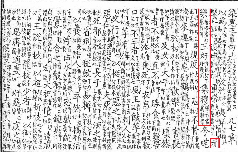 Mengzi yinyi 孟子音義, a phonetic commentary to the Classic Mengzi 孟子 by Sun Shi 孫奭 (Song period), from the collection Tongzhitang jingjie 通志堂經解. The example is from the chapter Liang Huiwang 梁惠王. Some characters of the first and second column are unfortunately not readable. The remark to the first expression in the third columns, 亦樂, says that the character 樂 is pronounced like 洛 throughout the whole chapter. The second commentary, to 王好, says that 好 is read 呼報切 (fanqie system), idem in the expression 好戰 further below. In the next character pair, 集穆, the first one is identified as a loan character for 輯, as a commentator Zhang 張 believes. |